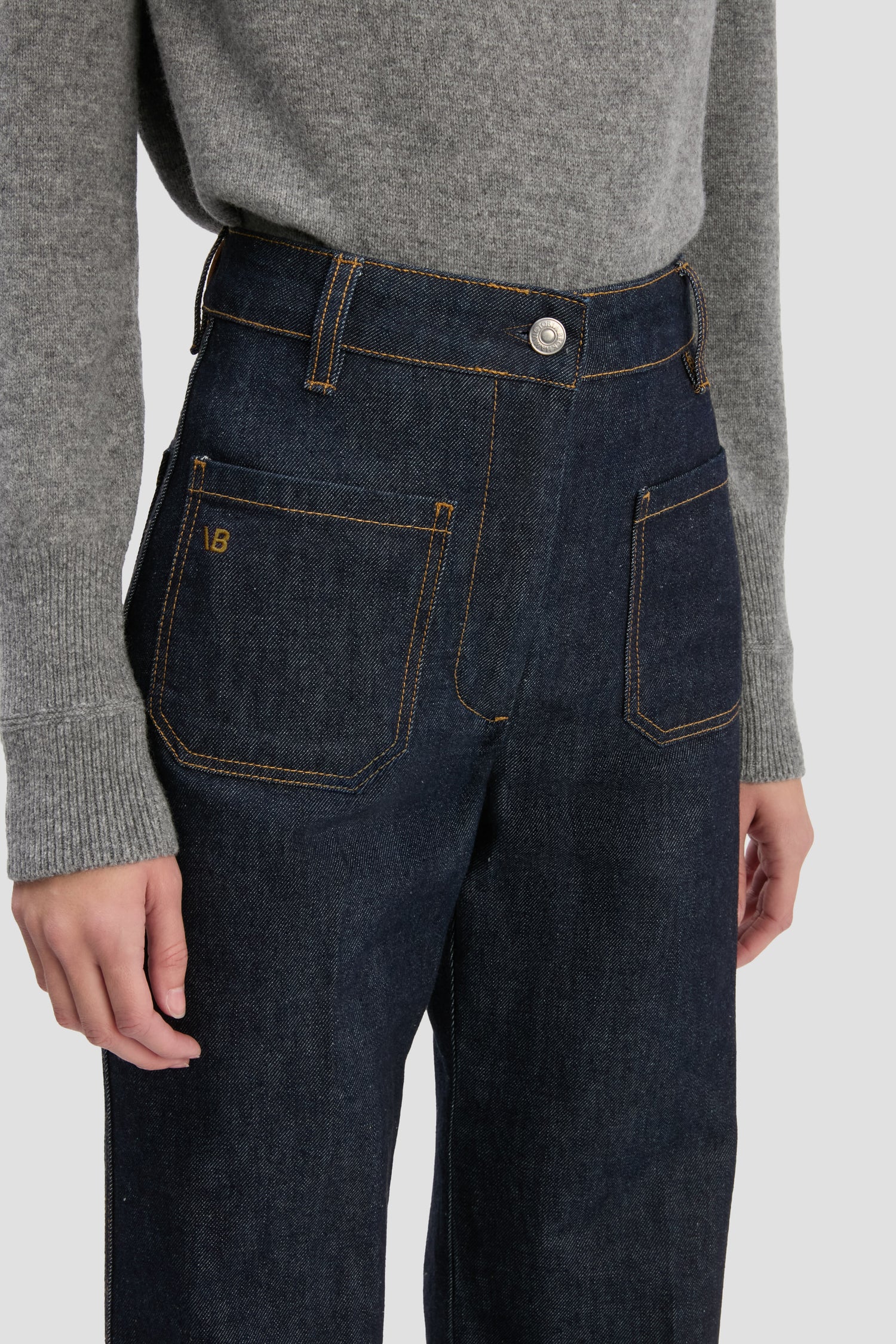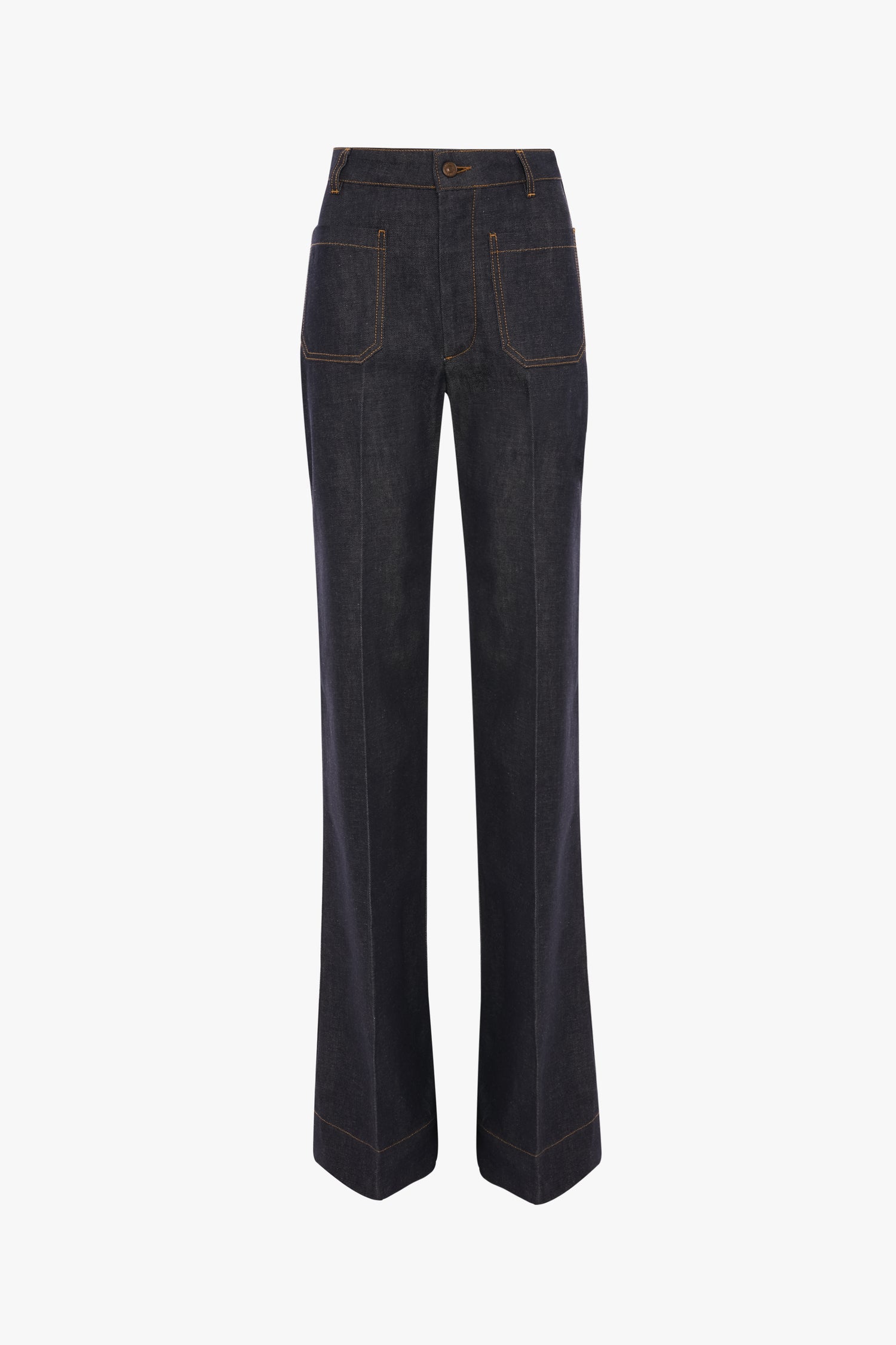 Crafted from stretch denim and presented in a flattering Indigo wash, the house’s signature Alina Jeans have a high waist and wide leg for a classic 1970s silhouette, with traditional patch pockets adding convenience and polish. A leather patch and Victoria Beckham embroidered logo complete the look.