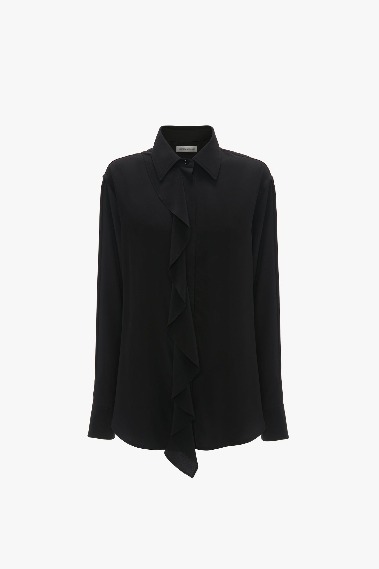 A flirtatious asymmetric ruffle drape brings a modern playfulness to this otherwise demure blouse. Crafted in fluid silk, it has a collared neckline and full-length sleeves with slight volume. Presented in classic Black for the new season, it is contemporary but timeless