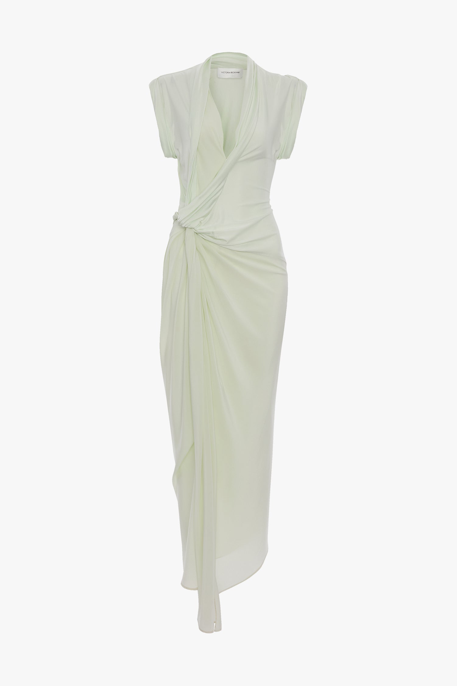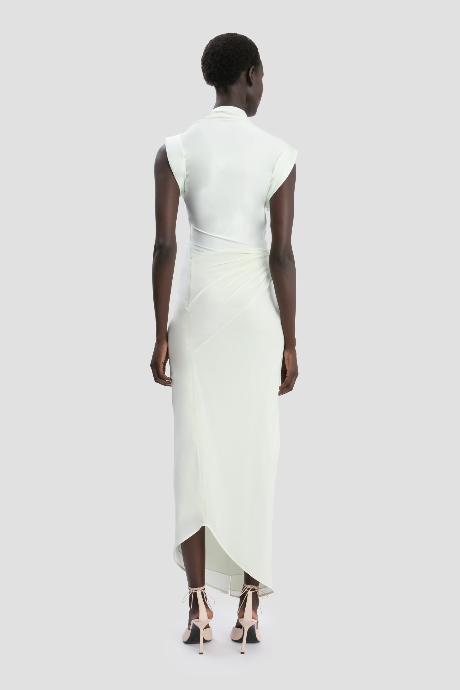 Contrasting textures on the bodice and skirt bring a tactile point of difference to the Twist Dress. Presented in an exclusive shade of Aloe, it has a wrap-front neckline with button closure, front skirt split and directional asymmetric hemline. Elevated design details include a short sleeve with rolled hemline and twisted drape neckline.