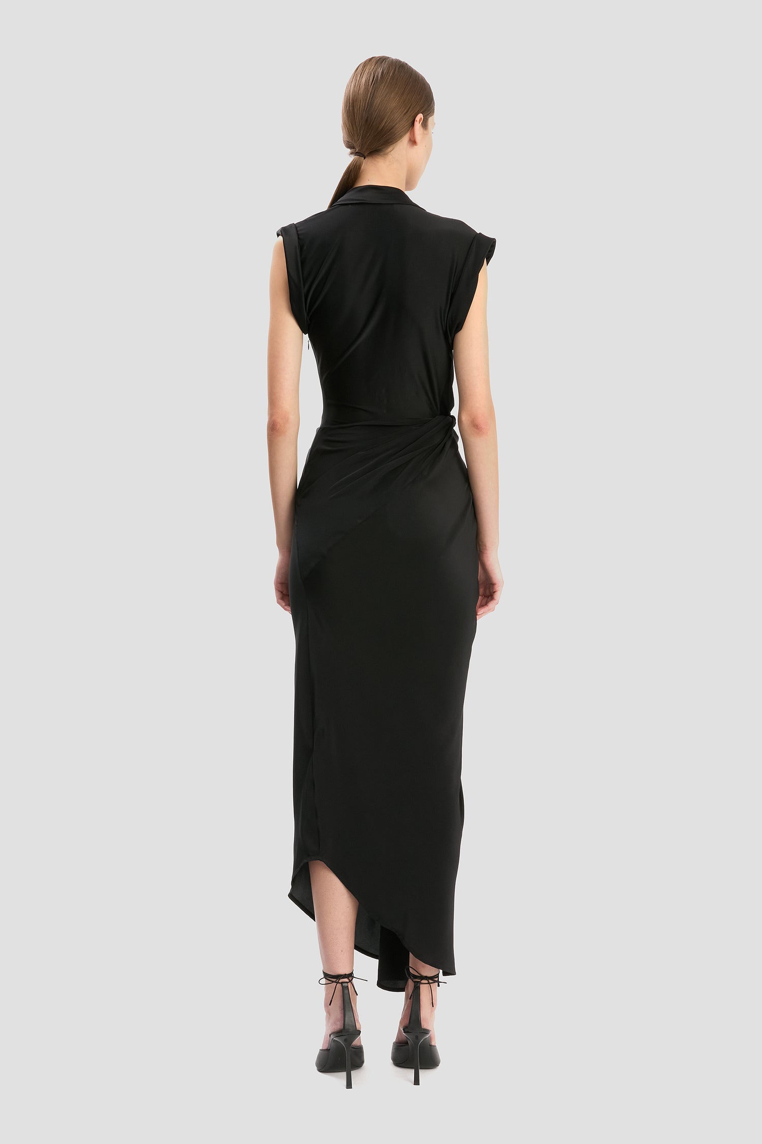 A reimagining of the classic little black dress, the Asymmetric Twist Detail Dress has a wrap-front neckline with button closure, front skirt split and directional asymmetric hemline. Tactile talking points, including a short sleeve with rolled hemline, twisted drape neckline and high-shine bodice, bring a subtle sensuality to this polished but provocative midi dress.