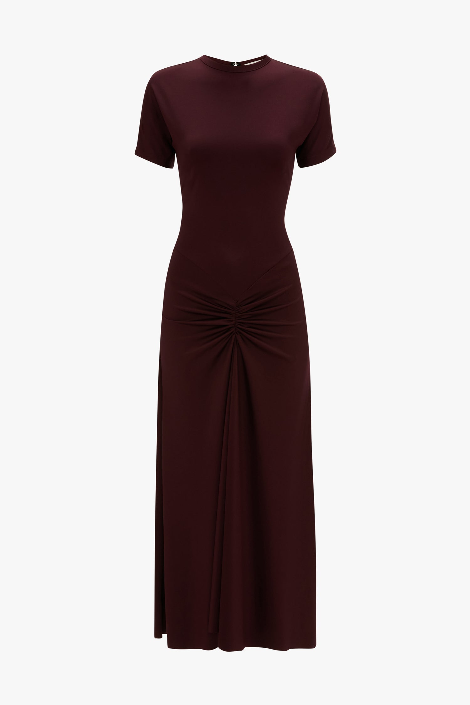 A reimagining of the house’s signature T-Shirt dress, the Blaire Midi Dress has a fitted bodice and a fluid, front-pleated skirt with longer-length hem at the back. Design details include a front V-shape waist seam and sensuous ruching. Presented in a rich shade of Merlot, it blends classic and contemporary references beautifully.