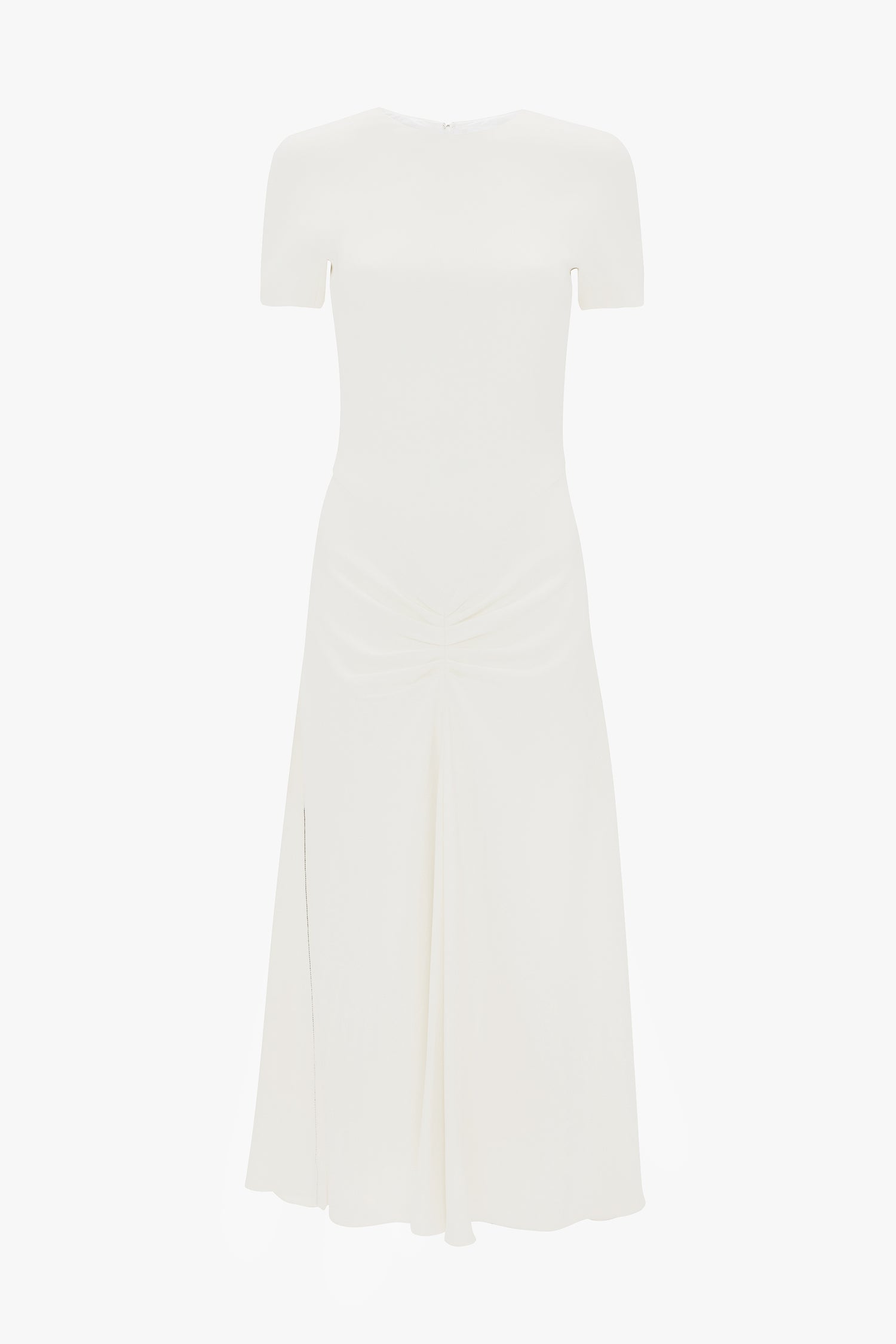 Taking references from the house’s signature T-Shirt dresses and hallmark midi styles, the Blaire Midi Dress In Ivory T-Shirt Midi Dress has a fitted bodice and a fluid, front-pleated skirt with longer-length hem at the back. A front V-shape waist seam adds definition to the silhouette, while the elegant shade of Ivory brings a romantic refinement.