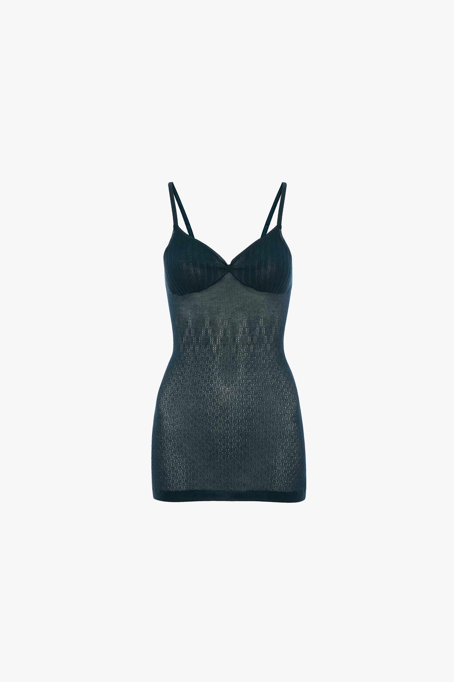 Reimagined in understated Teal, the Cami Top is crafted in a fine-gauge pointelle knit for a tactile finish. Designed with a slim fit and adjustable straps for absolute comfort, it has a ribbed bust cup, which brings an erotic undertone to this elevated basic.