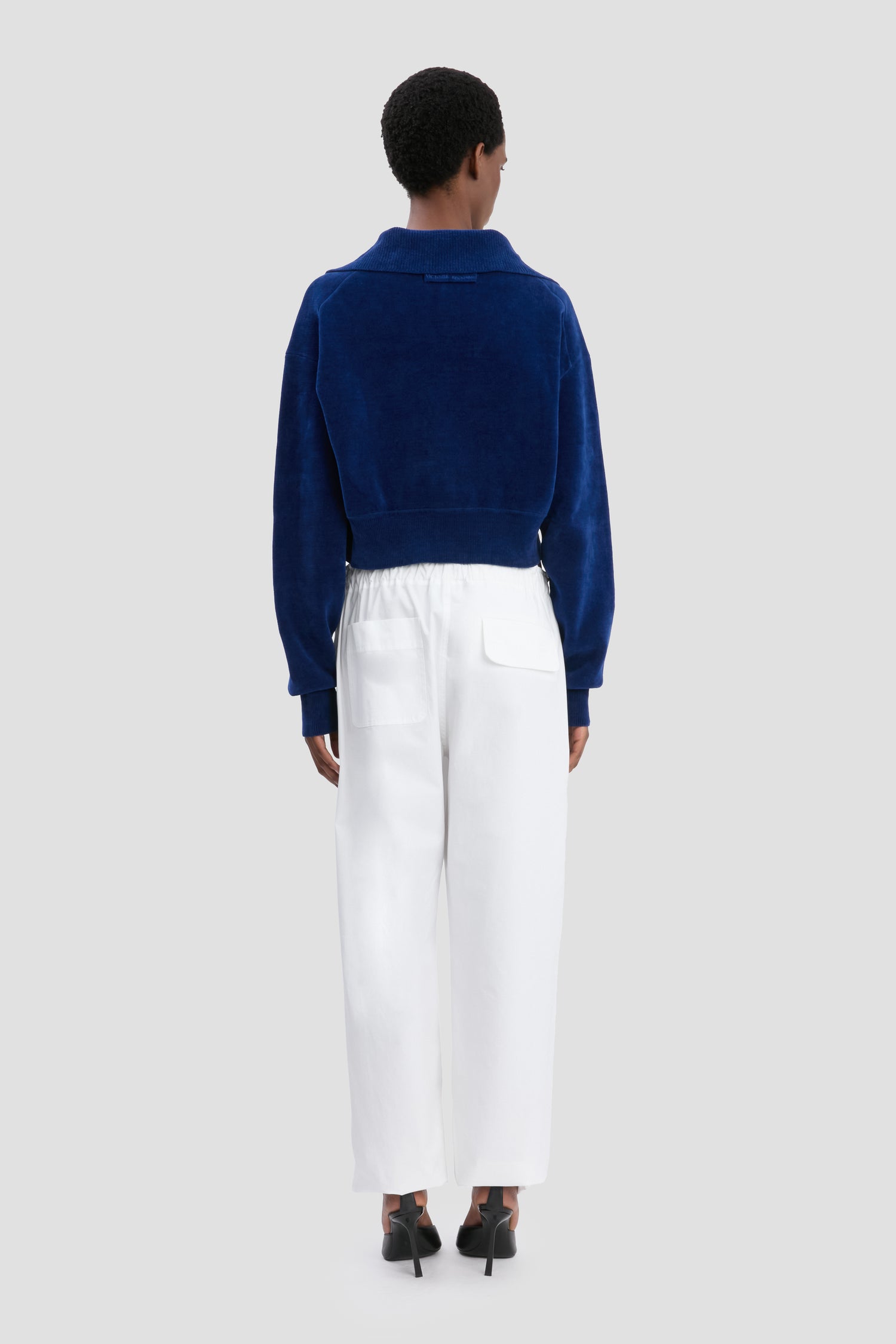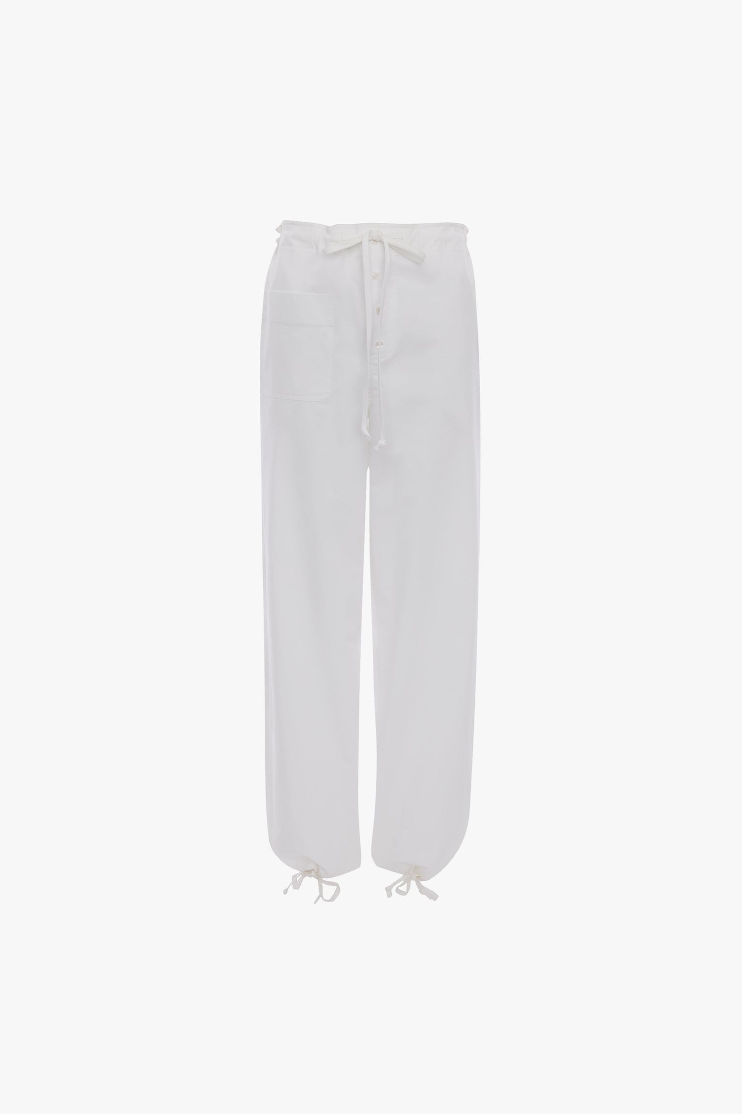 Utilitarian cargo pants are refreshed in a crisp White colourway. Classic workwear design codes include an elasticated waistband with ties and leg cuff ties, while an irregular pocket design and contrast stitching add a contemporary point of difference.