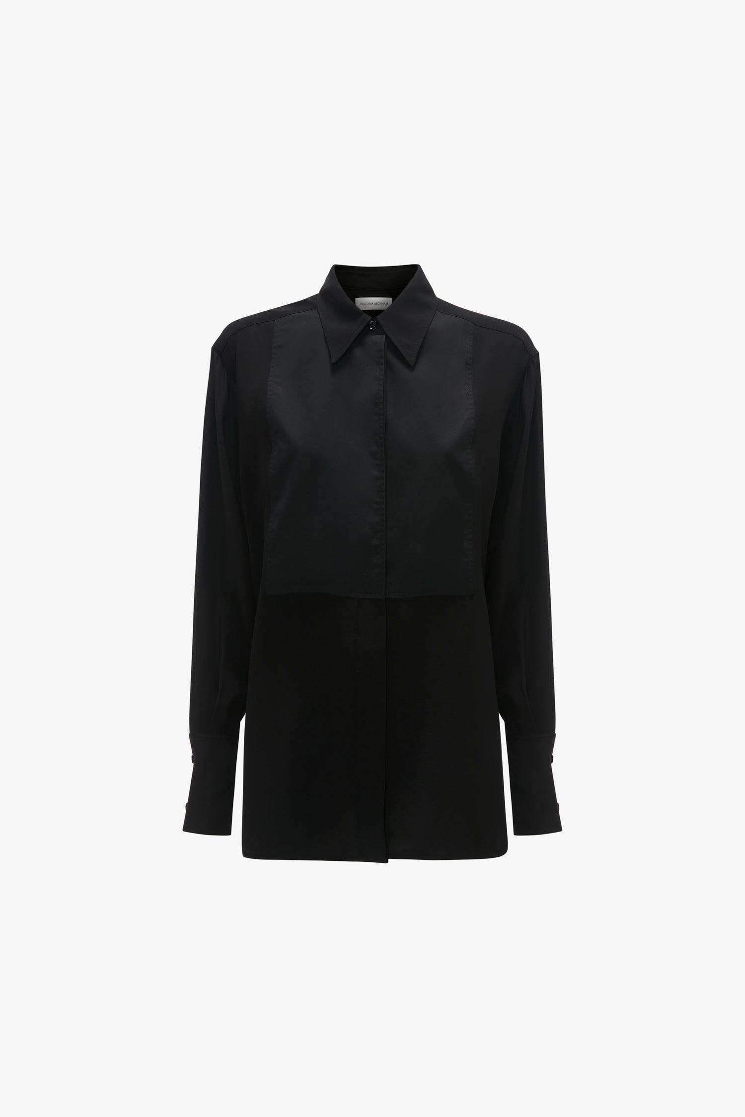 Tactile silk imbues this tuxedo-inspired shirt with a modern femininity. Design features include a contrasting fabric front bib and a box pleat detail at the back. Designed in timeless Black for versatility, it has full-length sleeves with button cuffs and a concealed button-front closure.