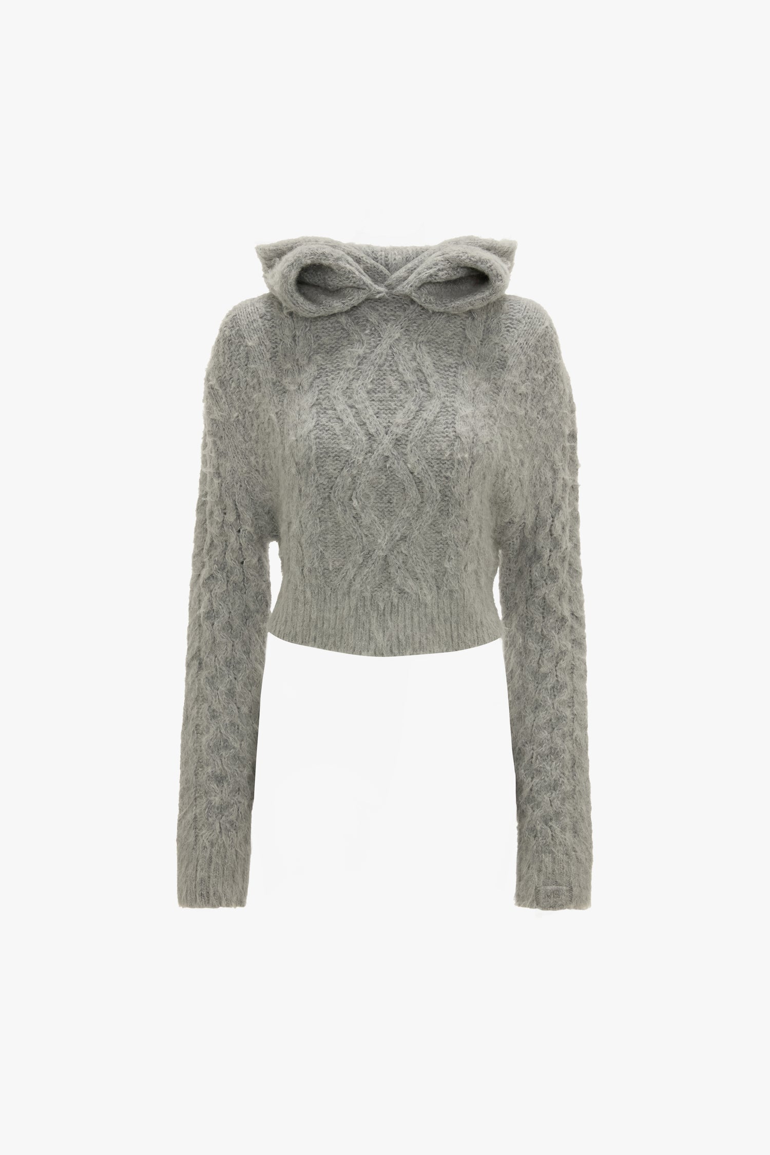 A statement piece from the Autumn/Winter runway, the Cropped Cable Jumper in Grey Melange has a sculptural rolled collar with a knitted hood, combining contemporary and casual design codes beautifully. Crafted from a lambswool-alpaca blend with a cable-stitch design, it has a cropped boxy fit and a ribbed hemline and cuffs. The house’s signature embroidered Victoria Beckham monogram completes the look.