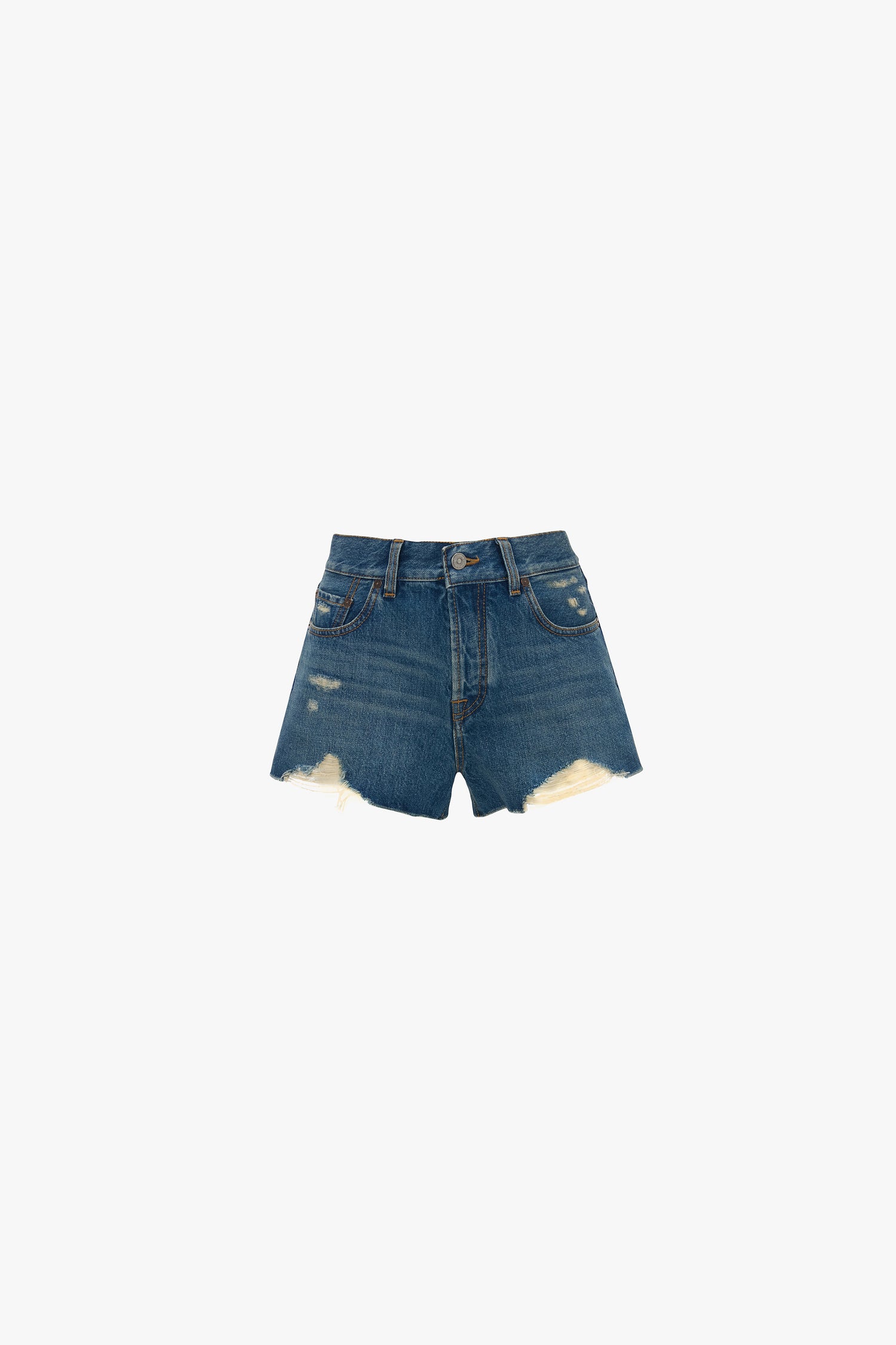 The Distressed Shorts in Mid Blue have a bohemian undertone that feels sexy and playful. Crafted from 100% organic non-stretch cotton denim, they have a low-rise waist and traditional five-pocket design. A branded leather patch and branded denim shank button complete the look.