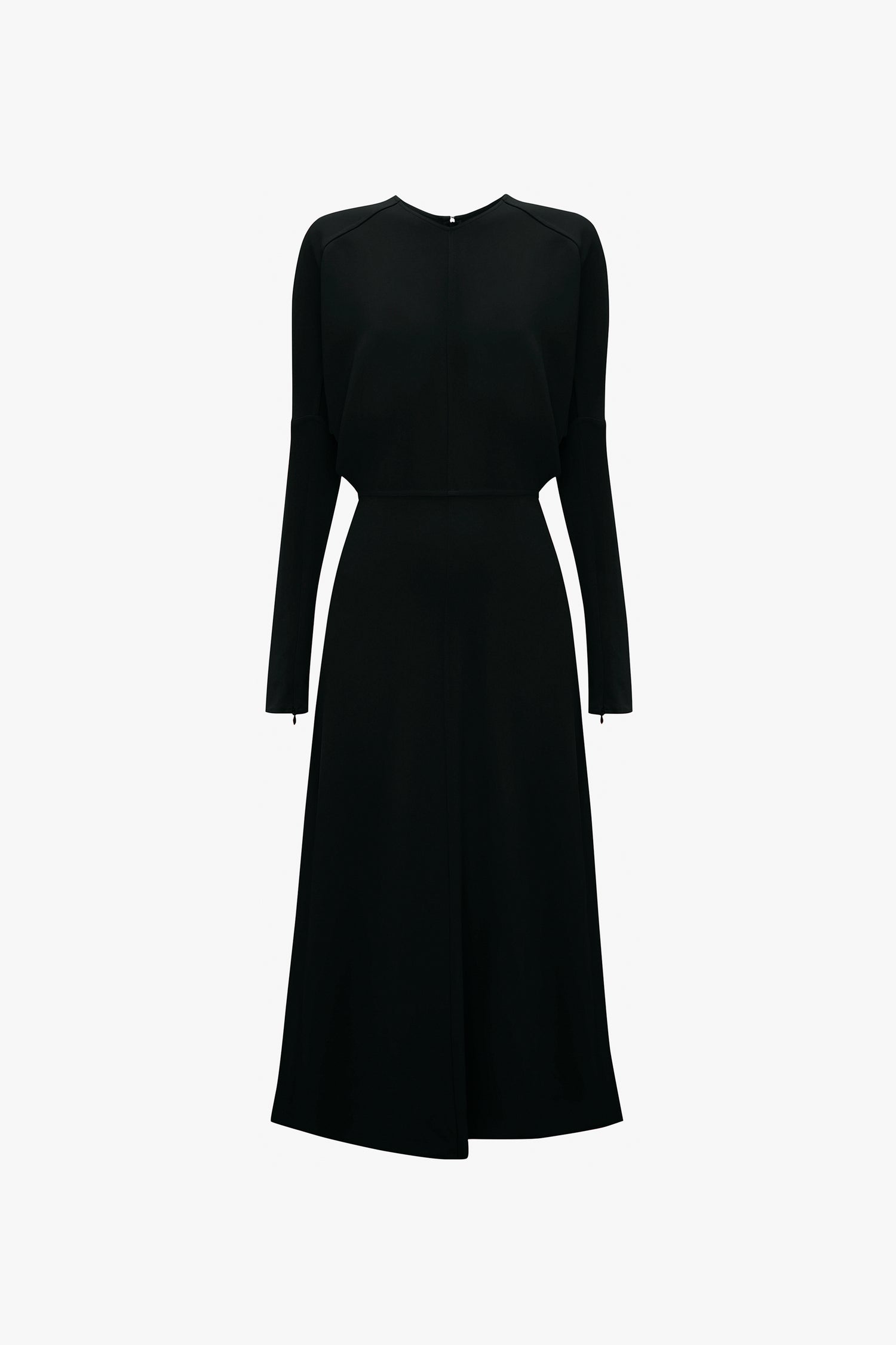 Cut from fluid, mid-weight cady in inky black, the Dolman Sleeve Midi excudes off-duty ease. The voluminous, draped shoulders bring a sense of softness and movement, while the fitted waist and narrow sleeves bring a structure that looks elegant both day and night.