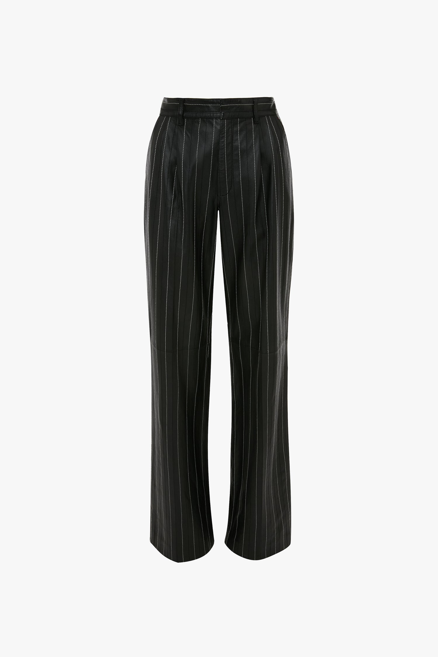 Crafted from supple lamb leather and presented in a Black-Ivory pinstripe, the Double Pleat Leather Trouser offers a utilitarian take on traditional smart tailoring. Cut with a high waist and straight leg, it has a double pleat detail for a flattering silhouette and a 6cm hem to allow for length alteration. Presented in a dynamic Black-Ivory pinstripe, it makes a confident statement for the new season.