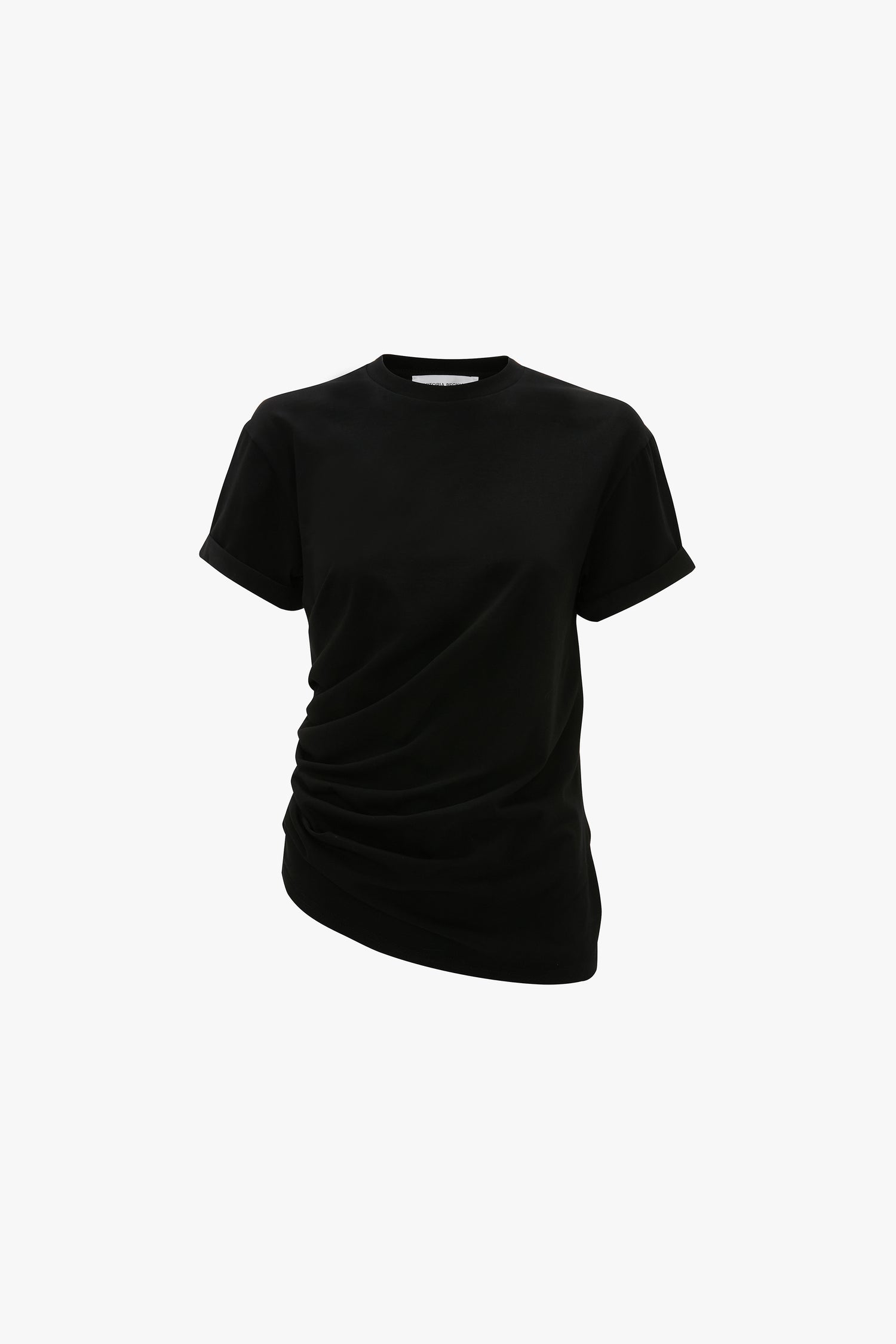 Elevated design details such as side ruching, an asymmetric hemline and a Victoria Beckham logo at the back of the neck imbue the Gathered Detail T-Shirt in Black with a sophisticated point of difference. Turned-back short-sleeve cuffs add off-duty ease, while the 100% organic cotton fabric brings a luxurious tactility.