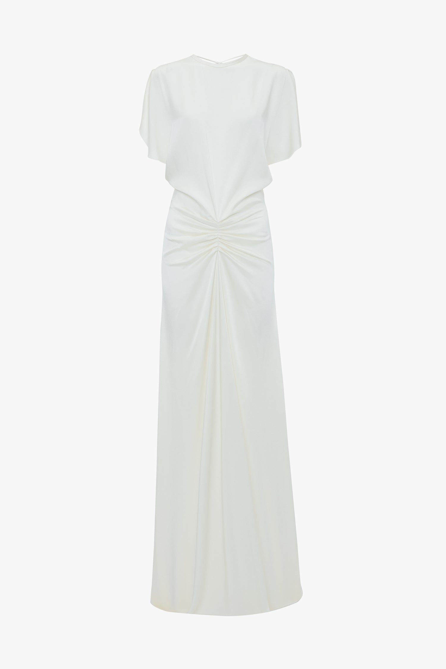 Reimagined in a nostalgic shade of Ivory, the Isabella Dress is a romantic proposition for the new season. Crafted from luxurious crepe back satin, it is fitted at the waist and hip for a flattering hourglass shape. A provocative open back design, elegant tie detail at the back of the neck and tactile pleating at the skirt add sensuous points of difference. A floor-pooling hemline adds a dramatic finishing touch.