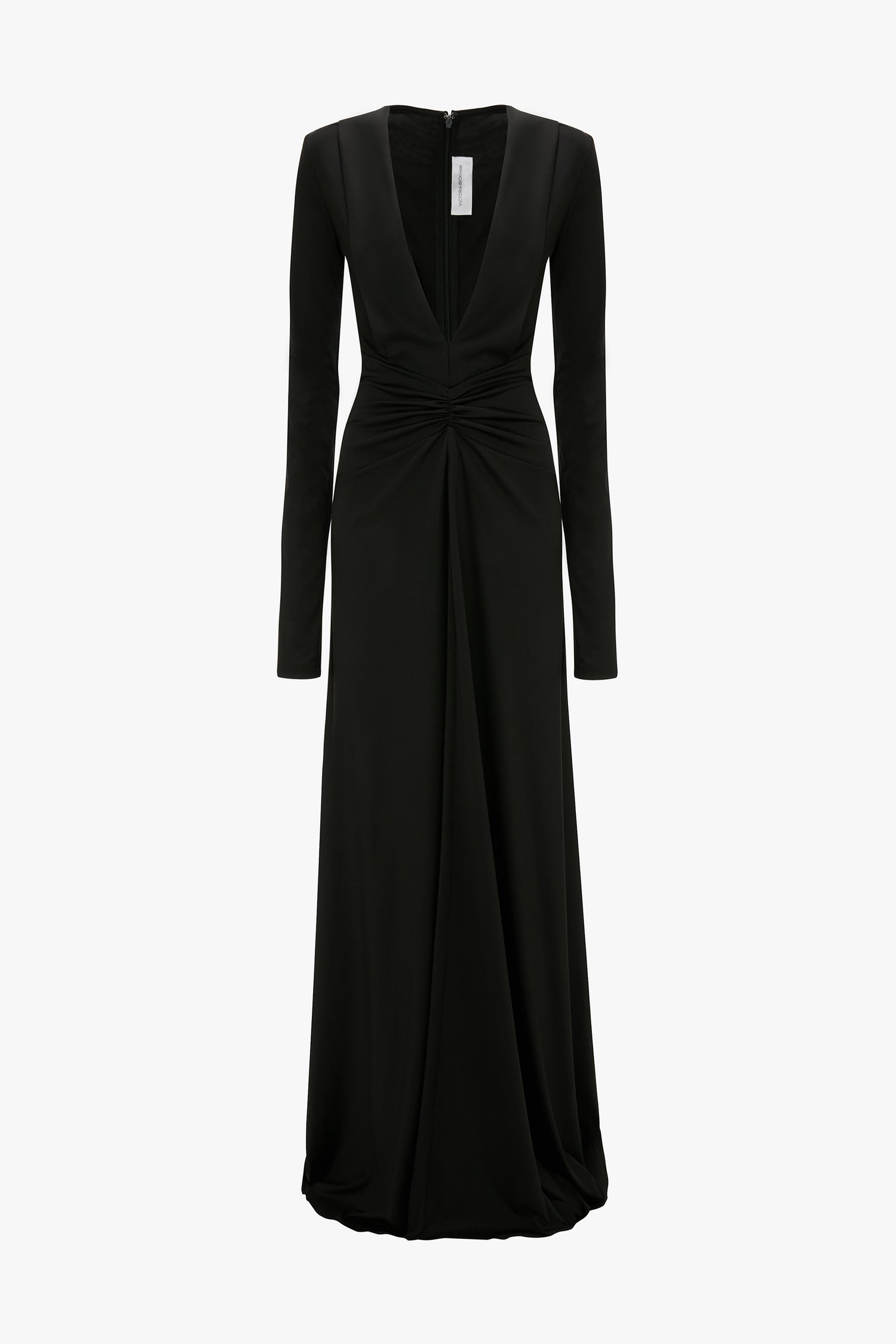 A plunging neckline and floor-pooling hemline give the Long Sleeve Deep V-Neck Gown in Black dramatic flair. Crafted from stretch jersey for a body-skulpting effect, it has elegant long sleeves, a V-shape waist seam and tactile front ruching. Expressive but understated, it perfectly reflects the house’s refined sophistication.