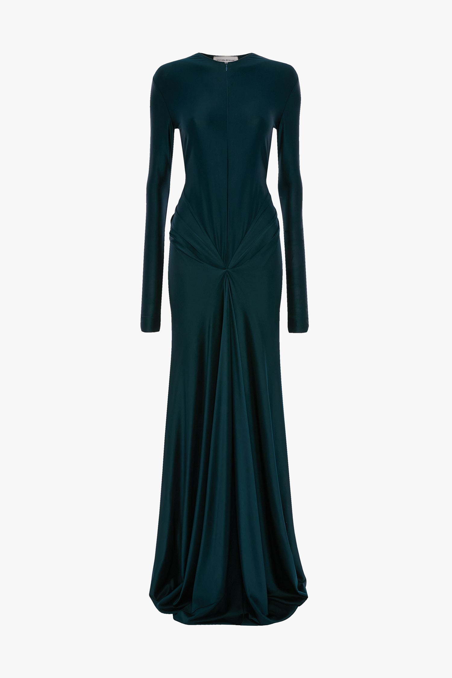 The Twist Waist Gown’s demure silhouette is imbued with dramatic flair by virtue of a floor-pooling hemline and sensuous knotted detail at the front waist. Crafted from a body-sculpting high-shine jersey, it has a side-seam split and longer-length sleeves with tactile ruching at the cuff.