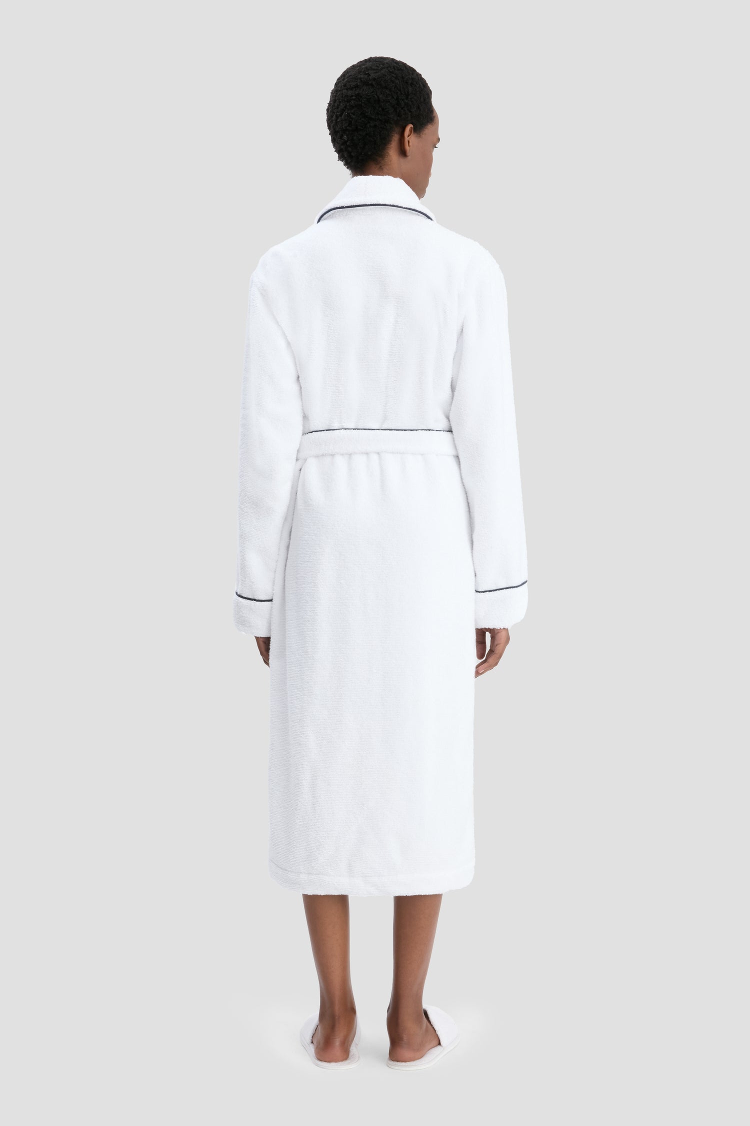 Discreet piping in contrasting navy brings an elevated point of difference to the Towelling Robe in White. Made from super-soft 100% cotton for absolute comfort, it has a mid-length hemline, lower patch pockets and a wrap-style belt. A single chest pocket is adorned with the house’s signature Victoria Beckham monogram.