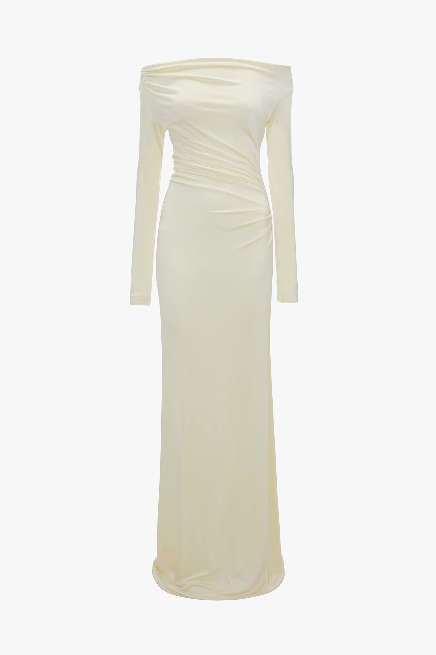 Clean lines and an elongating silhouette imbue the Off-Shoulder Draped Gown with contemporary flair. Defined by its subtly sexy off-shoulder neckline, it has contrasting long sleeves and a floor-pooling hemline. A discreet pleat detail adds a touch of tactility, while the stretch jersey fabrication fits and flatters any figure. Presented in romantic Ivory, it is a confident take on contemporary evening wear.