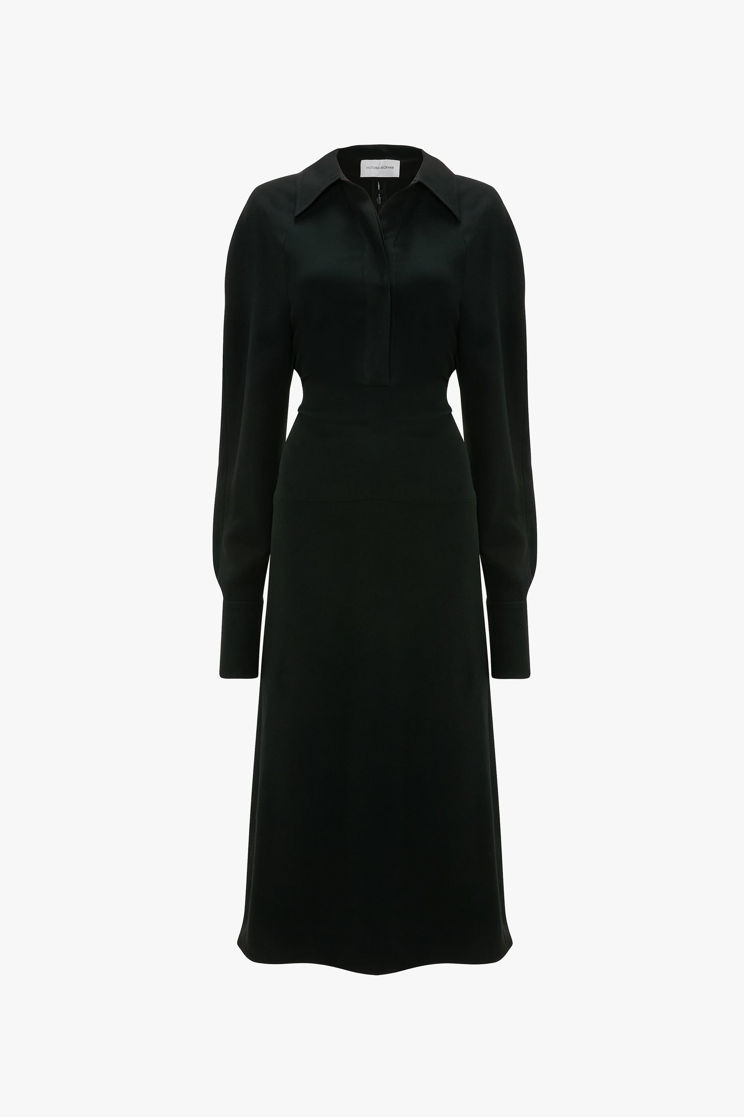 Relaxed tailoring defines the Polo Collar Dress. With raglan sleeves, a traditional collar and concealed front placket, the dress has a masculine undertone, which is counteracted by a feminine skirt with longer-length hem at the back. Black branded shirt buttons along the front placket and at the cuffs and contrast topstitching at the sleeve placket complete the look.