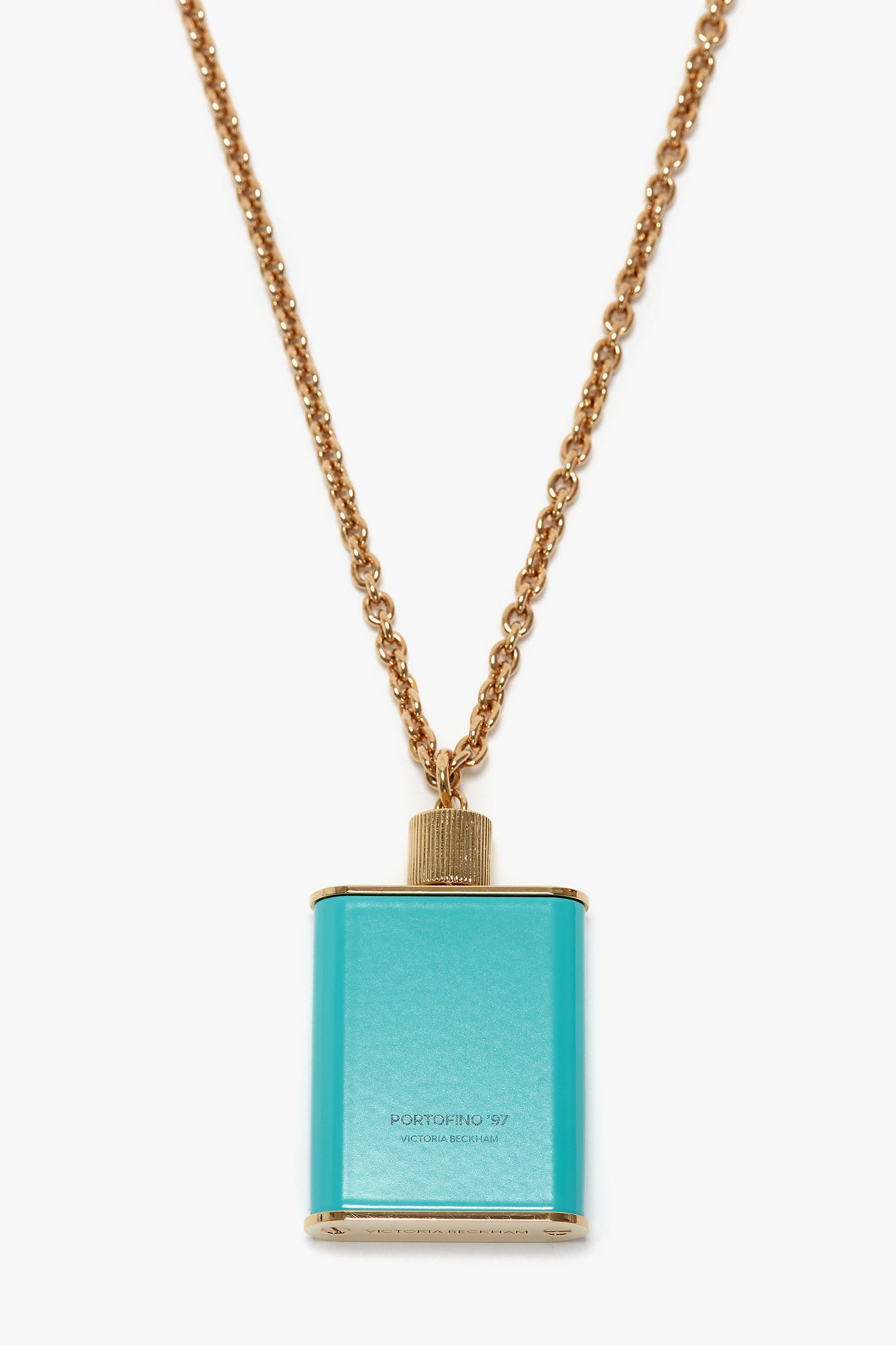 Designed to carefully hold the house’s Portofino signature scent, this unique pendant is exquisitely crafted in Italy from gold brushed brass. it is beautifully finished with a lobster clasp and Victoria Beckham branding at the bottom of the charm.