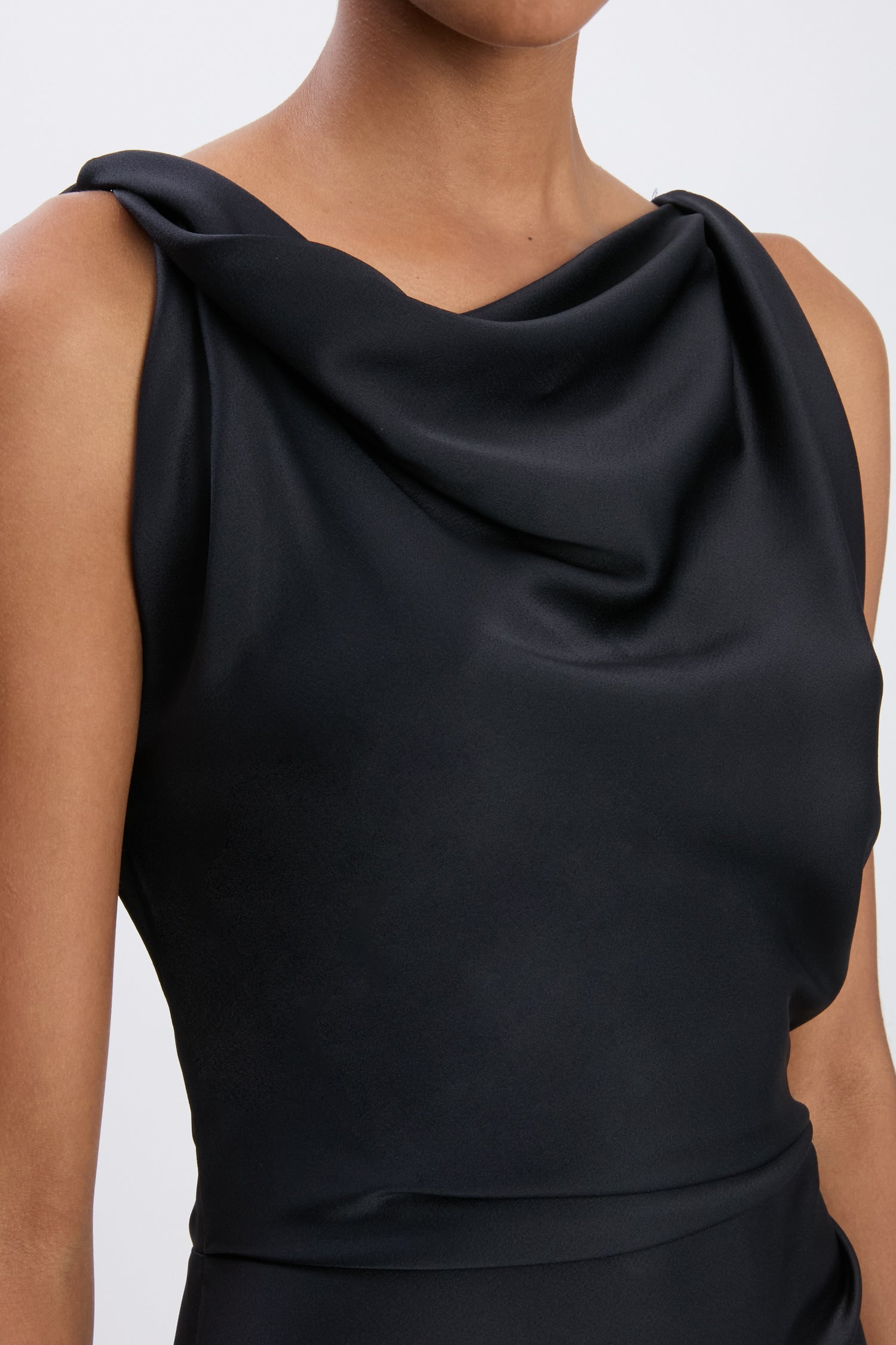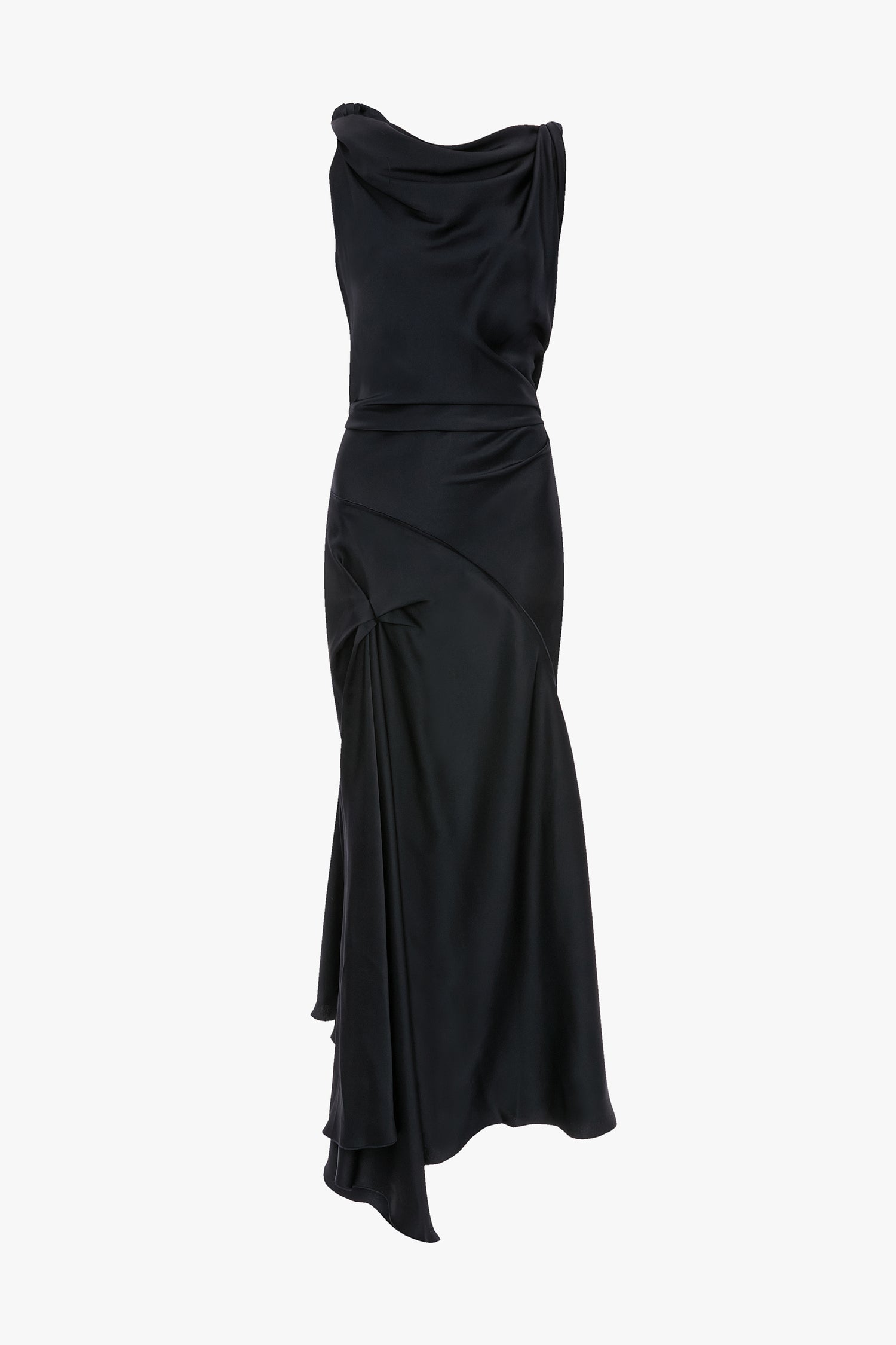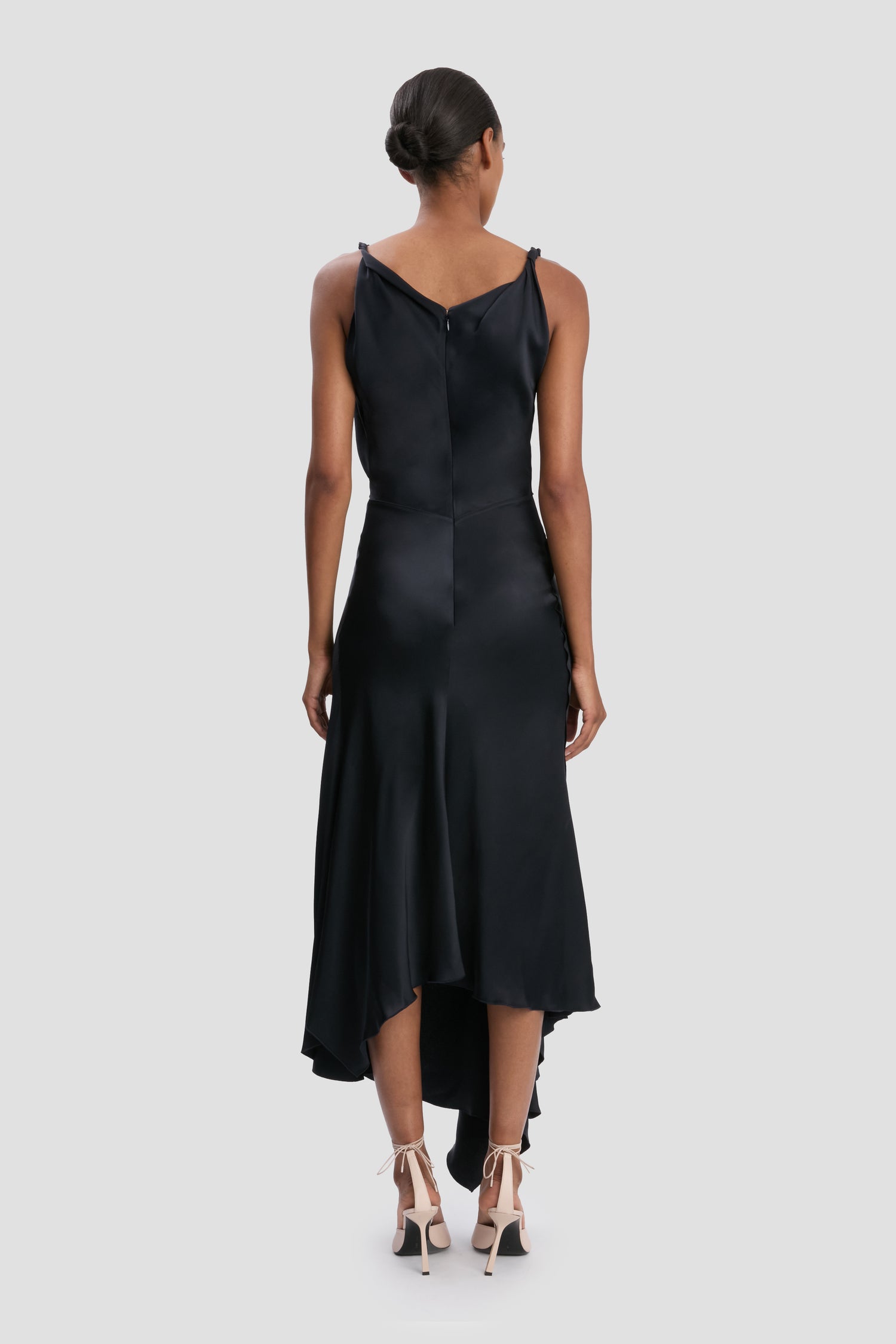 Directional draping brings a sensuous tactility to the Posy Midi Dress in Navy. Crafted from crepe back satin, it has twisted shoulder straps and a pleated detail at the waist and front skirt. An asymmetric hemline brings fluidity to the silhouette, while exposed seams and a contrasting topstitch reflect the house’s love of discreet but elevated talking points.