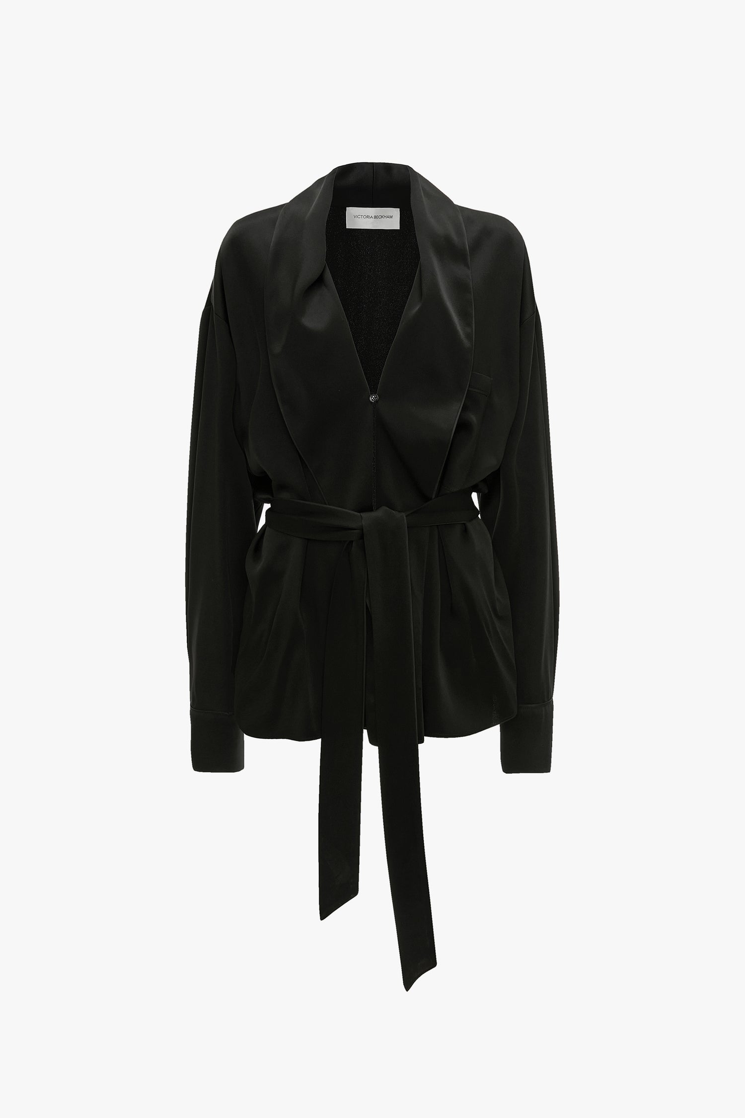 Deconstructed tailoring is part of the Victoria Beckham brand DNA and it is embodied in the Pyjama Wrap Blouse in classic Black. Crafted from tactile crepe back satin, it is defined by an oversized fit, distinctive shawl collar and fluid wrap belt. Elevated design details include decorative piping on the cuffs, chest pocket and belt, while a centre front button closure beneath the wrap belt ensures comfort and modesty.