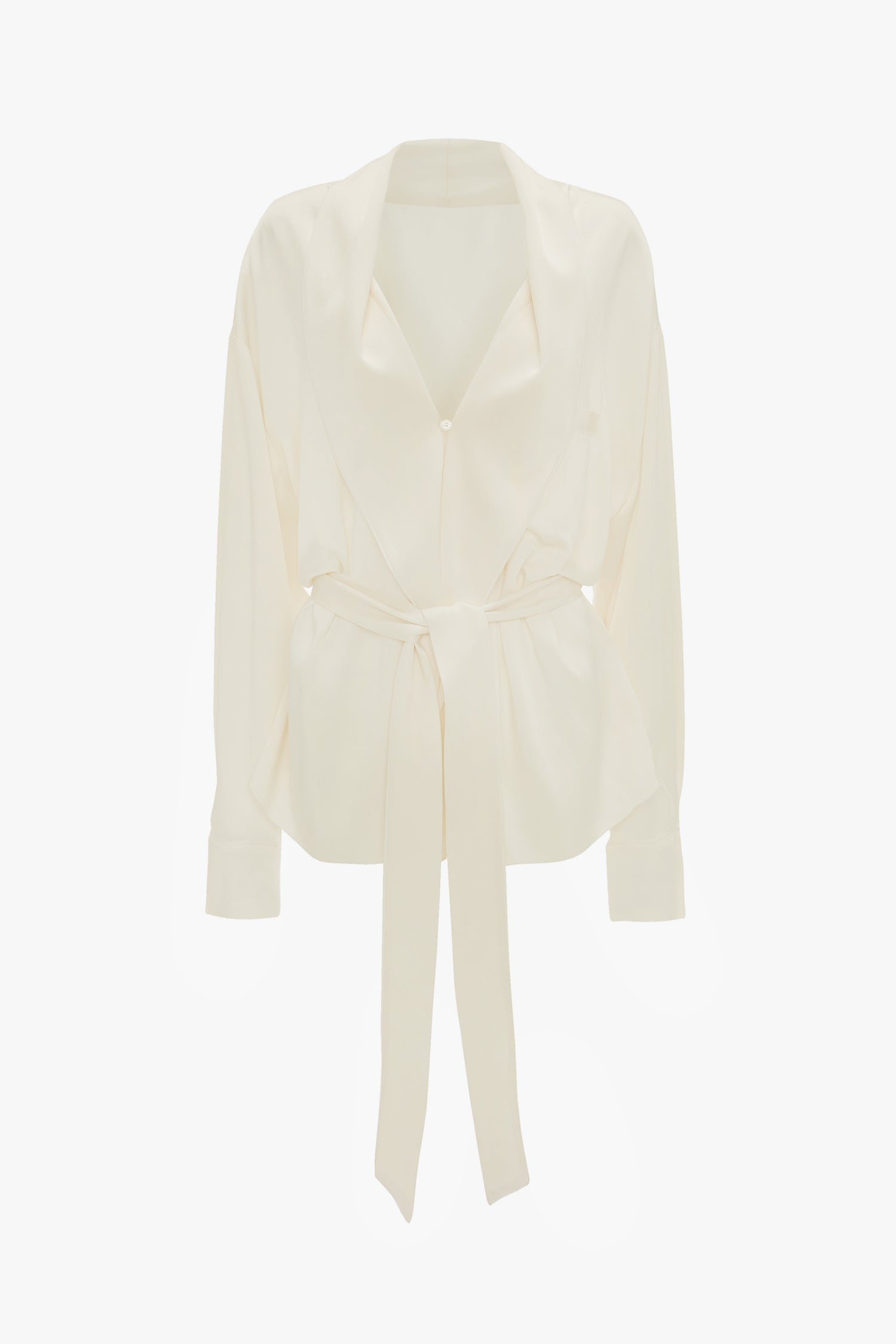 Relaxed tailoring is a house signature and the Pyjama Wrap Blouse in Ivory embodies this deconstructed approach to traditional suiting. Crafted from tactile crepe back satin, it is defined by an oversized fit, distinctive shawl collar and fluid wrap belt. Attractive design details include decorative piping on the cuffs, chest pocket and belt.