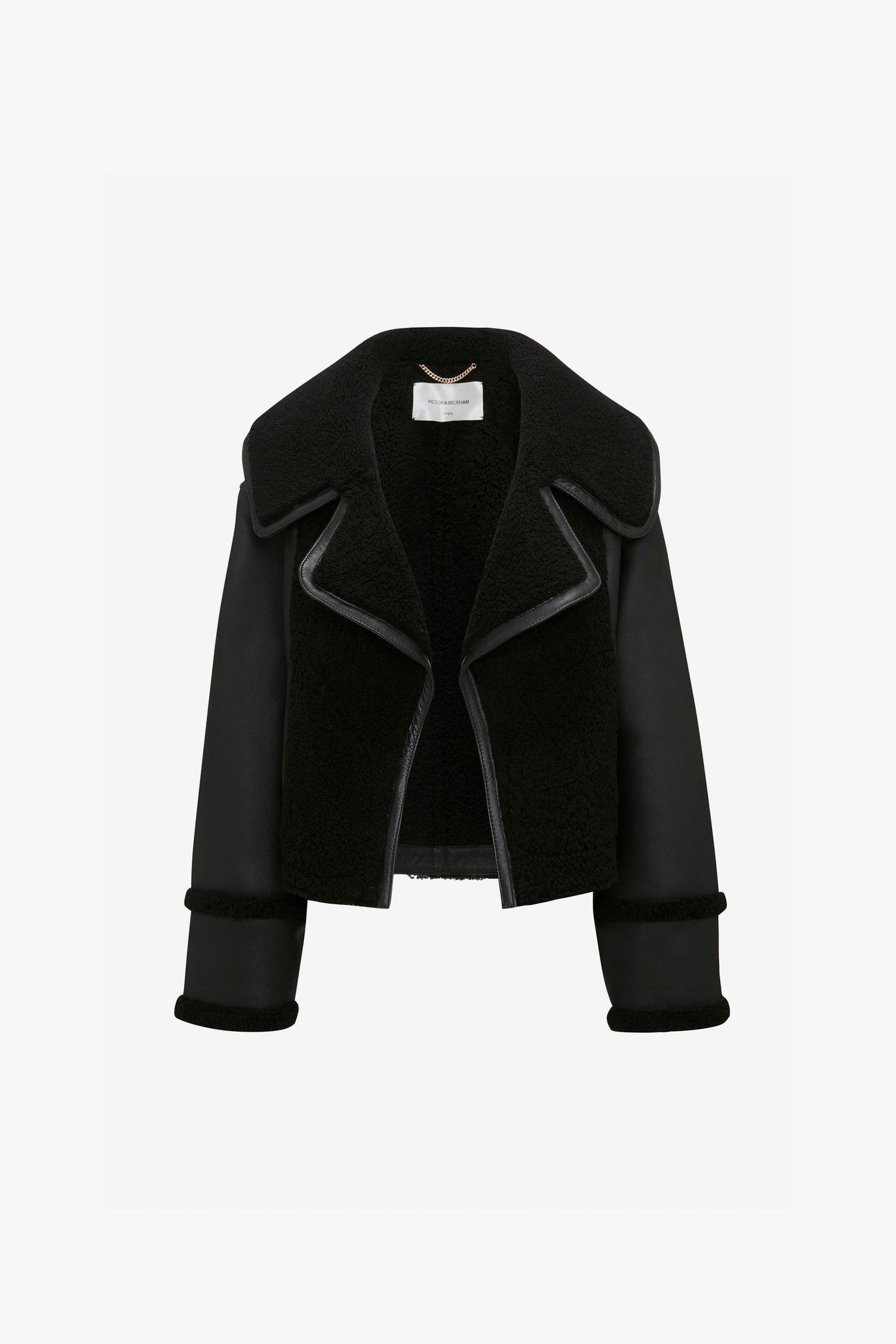A cropped silhouette, extra-wide collar and luxurious shearling fabrication elevate the traditional aviator-style jacket into a modern classic. Practical but polished, it has centre front snap fasteners and sophisticated twin topstitch detailing. Presented in classic Black, it will bring a utilitarian edge to smart tailoring of feminine separates.