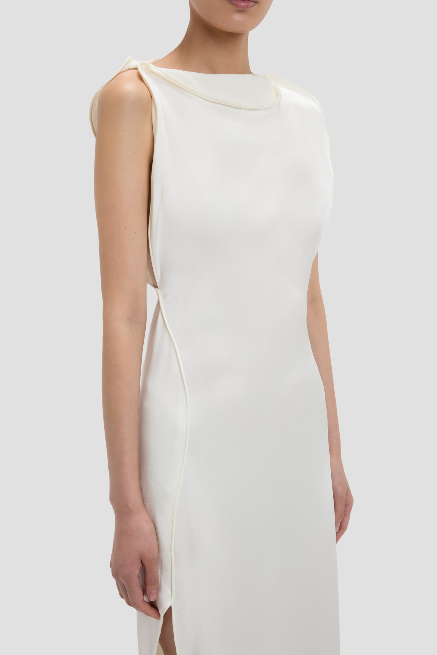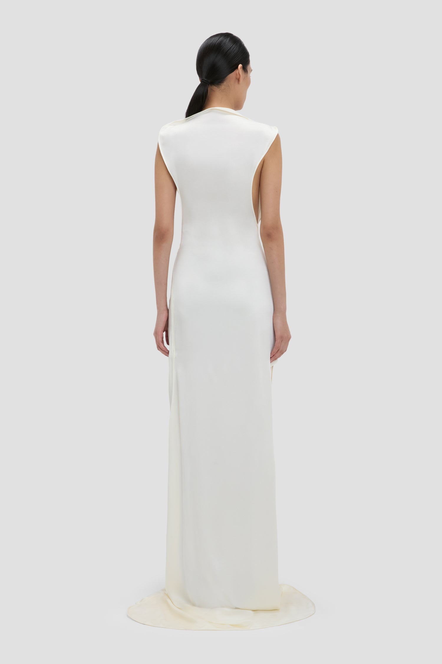 A floor-pooling hemline with long back train brings quiet drama to the Carla Gown. Presented in nostalgic Ivory, it is crafted from crepe back satin for a sensuous, figure-flattering drape. A provocative side split adds a sexy undertone.