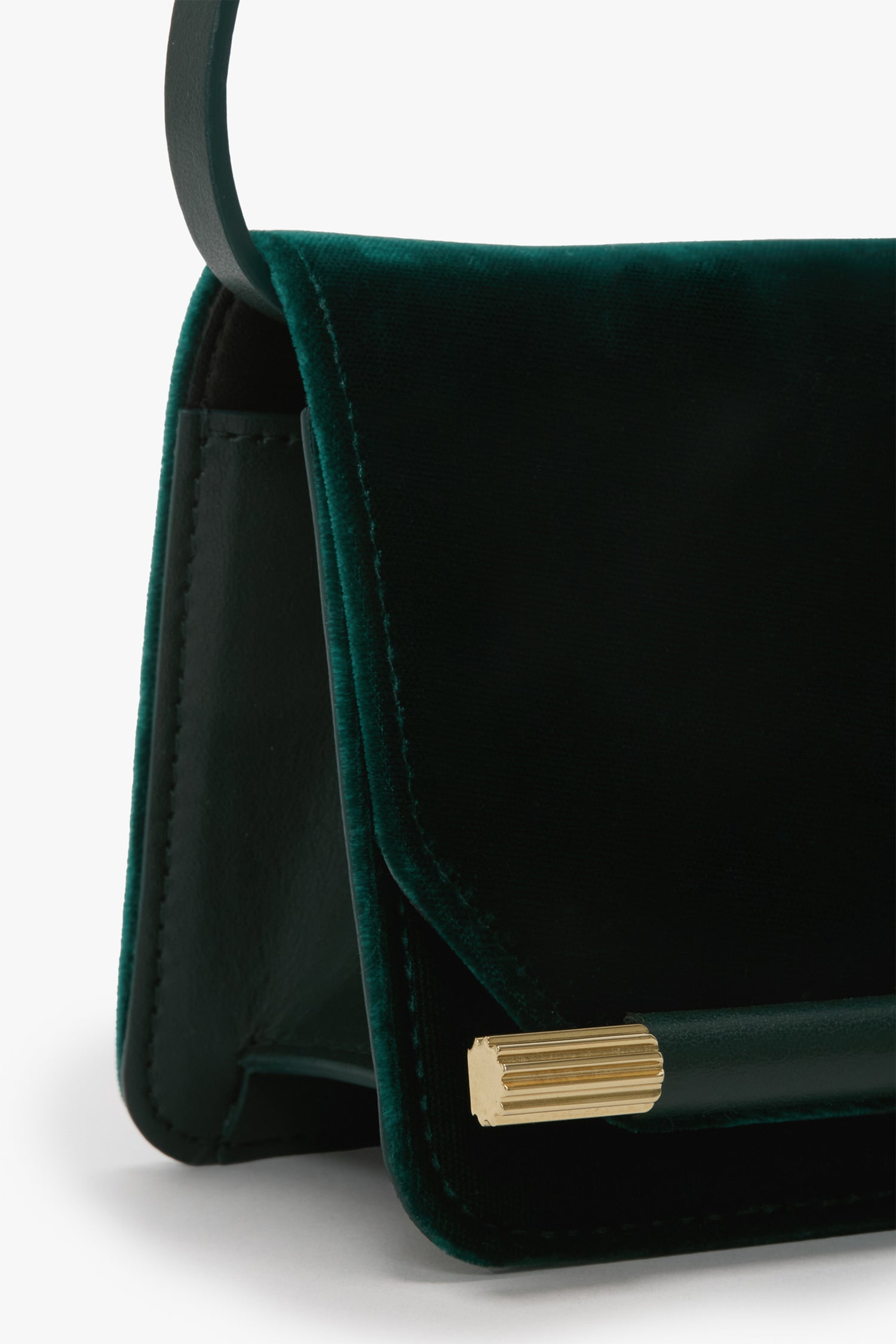 Dark Green velvet brings an opulence to the 202 Clutch Back With Strap. Featuring the 202 family’s signature menswear-inspired front cufflink detail, it also has a Victoria Beckham logo and unique serial number that nods to Victoria’s London studio address. Practical design details include a removable strap, internal compartment and internal flat leather pocket.