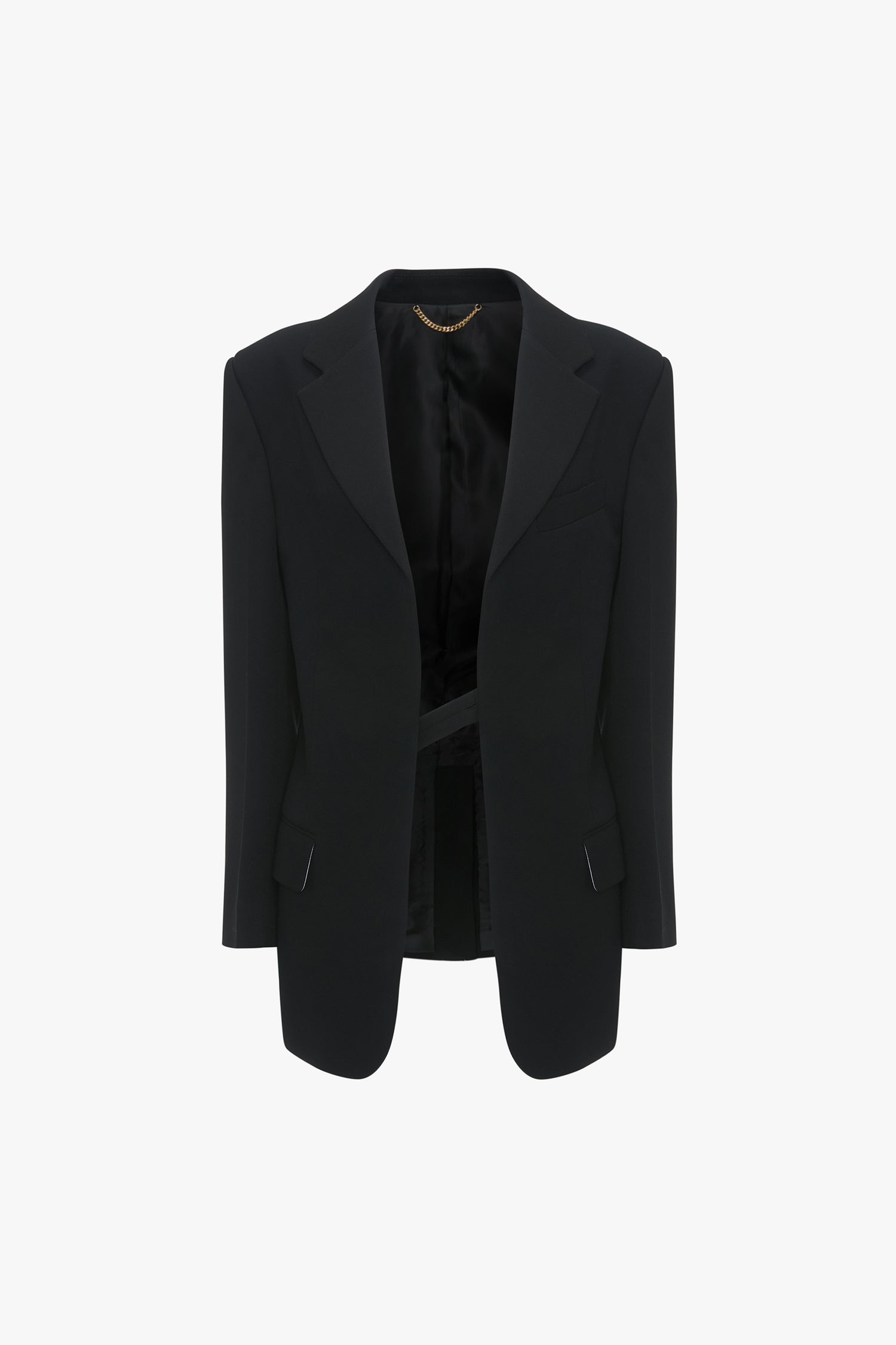 Contemporary tuxedo style is reflected in the Tux Jacket. A wide shoulder gives it a distinctive point of view, while sharp creases on the body and sleeves bring structure and definition. Tailored from a grain de poudre blend, it has a contrasting white melton fabric beneath the collar, front pockets with flaps, a single welt pocket at the chest and an inner tab for fastening.