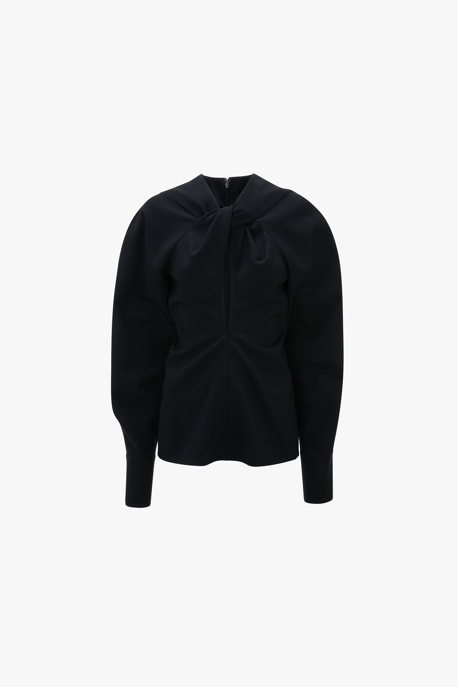 The Twist Detail Top is defined by a front split opening that adds a playfully provocative finish to this polished and professional piece. Additional design features include a front neck twist detail, wide sleeves with narrow cuffs and a contrasting red stitch on the button placket. Crafted from wool crepe with a slight stretch and presented in versatile navy, it is an elevated wardrobe staple.