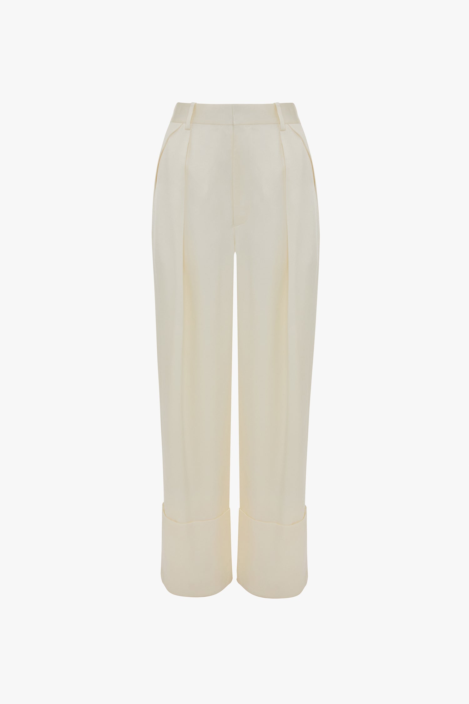 A refined take on classic tailoring, the Tailored Trousers in Ivory are crafted from fluid satin crepe for a polished yet effortless feel. Designed with a flattering high-rise waist, they fall into a wide-leg silhouette, accentuated by front pleats and deep turned up hems for a sense of modern structure.
