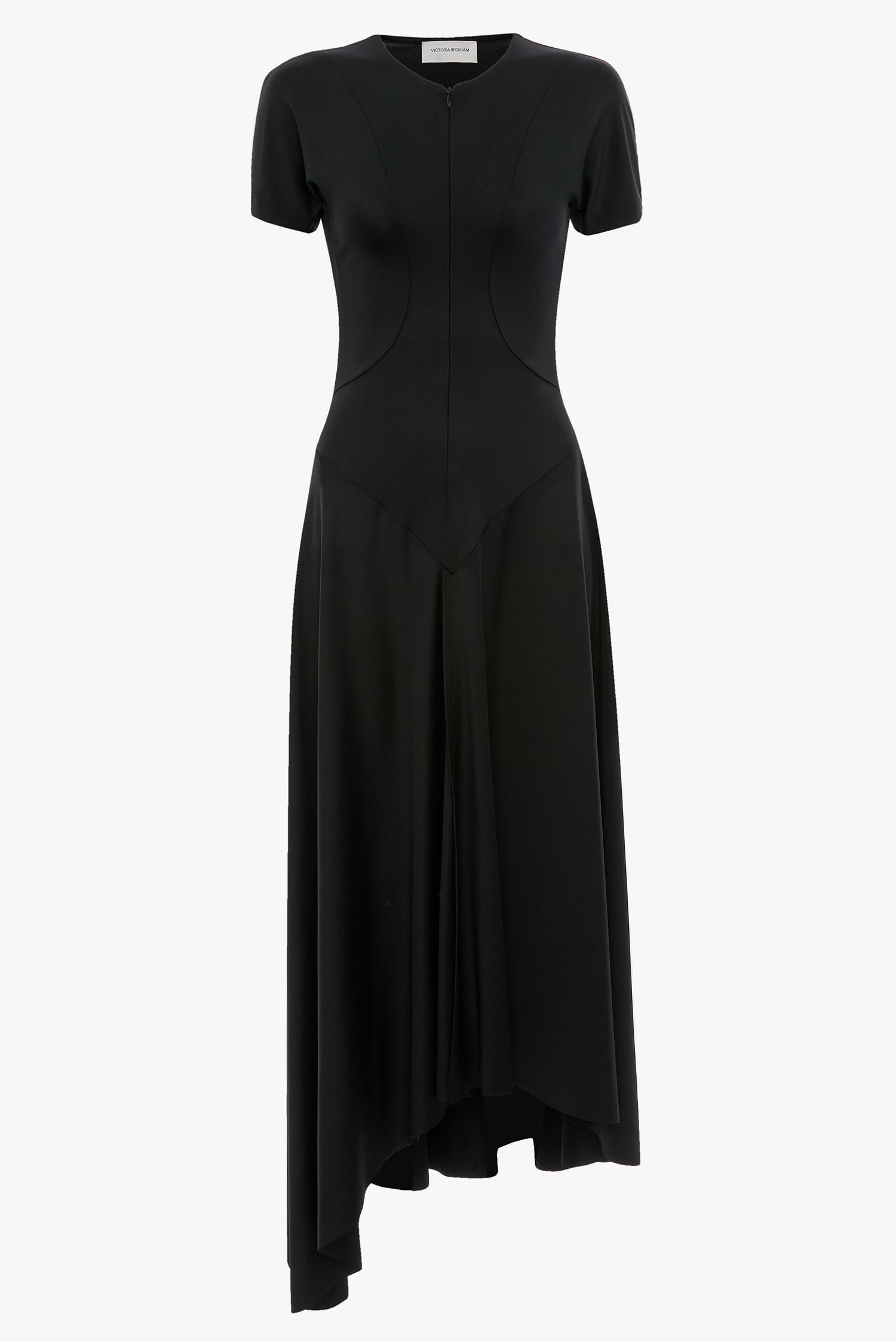 A distinctive take on the classic black dress, the Zipped Front Midi Dress has a fitted bodice with panelling and fluid skirt for a figure-flattering silhouette. Crafted from a comfortable stretch jersey, it has a concealed front zip and playful asymmetric hemline.